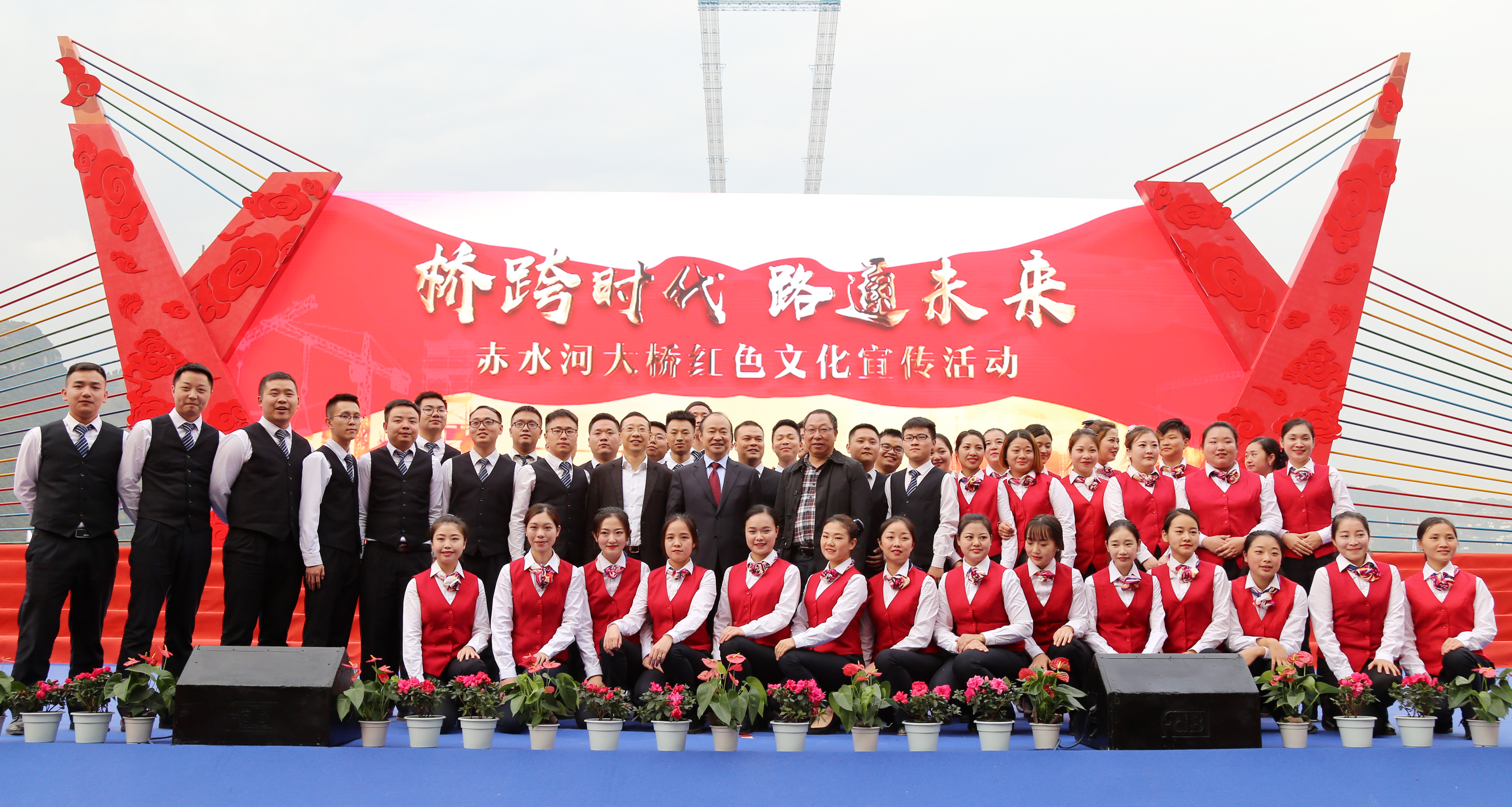 為深入貫徹落實黨的十九大精神和習近平新時代中國特色社會主義思想,弘揚紅軍長征精神,展示赤水河大橋建設風采,助力南向開放門戶打造和精準扶貧攻堅,同時為紀念改革開放40周年、慶祝省鐵投集團成立10周年、四川路橋集團成立20周年,2018年10月26日,由省鐵投集團主辦、四川路橋集團和四川敘古高速公路公司、赤水河大橋項目部共同承辦的“橋跨時代 路通未來” 赤水河大橋紅色文化宣傳活動在赤水河大橋工程建設現場隆重舉行。