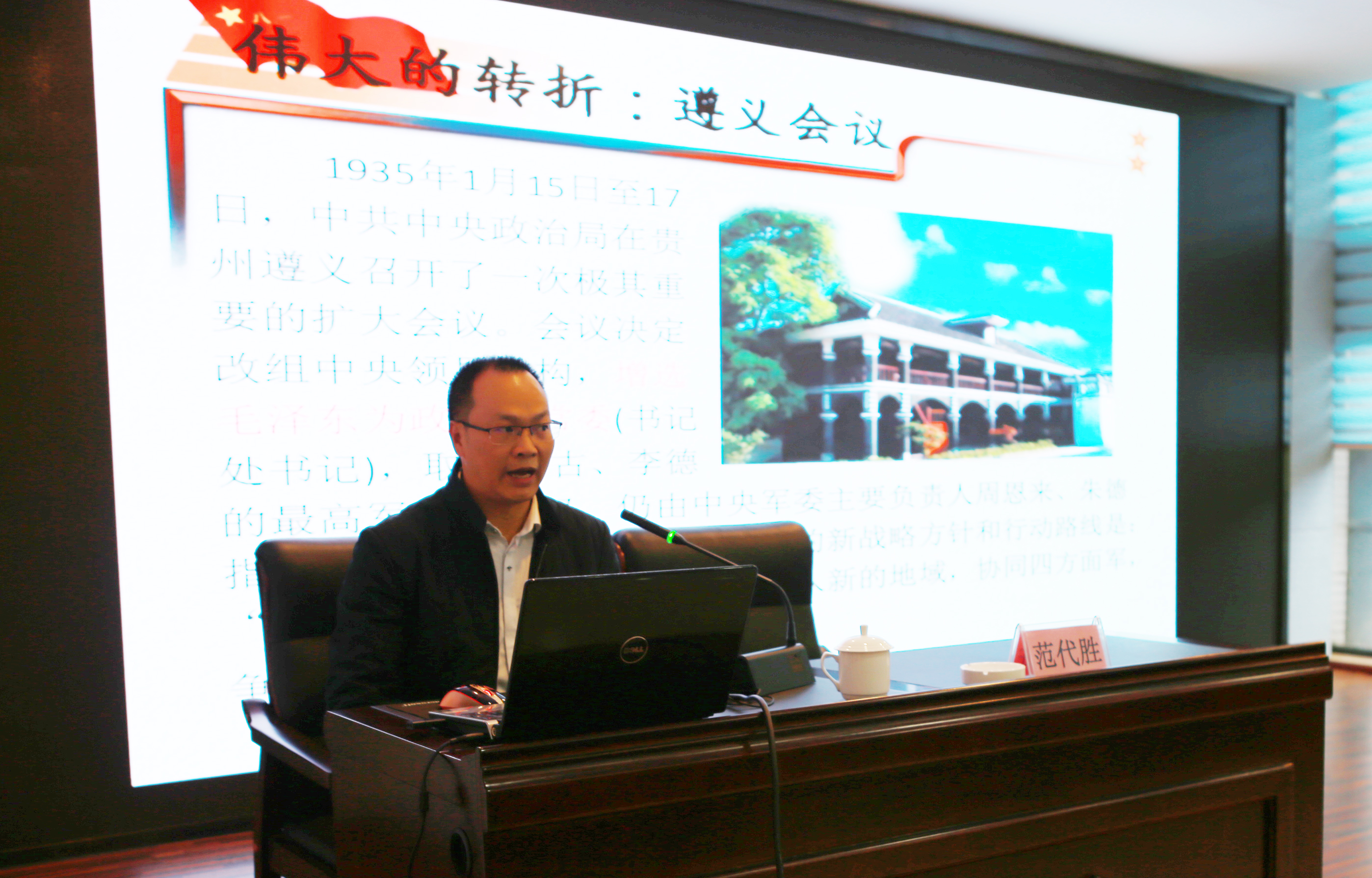 范代勝老師分別從四渡赤水戰(zhàn)役概況、毛澤東的得意之處、四渡赤水在古藺、四渡赤水的啟示方面深入淺出講述了紅軍四渡赤水的前因后果。為執(zhí)行遵義會(huì)議北渡長(zhǎng)江與紅四方面軍會(huì)合的決定,1935年1月19日,中央紅軍離開遵義北上,由此有了紅軍長(zhǎng)征驚心動(dòng)魄的四渡赤水經(jīng)典之戰(zhàn)。四渡赤水,體現(xiàn)了毛澤東機(jī)動(dòng)靈活的戰(zhàn)略戰(zhàn)術(shù)原則,是以少勝多、變被動(dòng)為主動(dòng)的運(yùn)動(dòng)戰(zhàn)典范,是紅軍長(zhǎng)征中最驚心動(dòng)魄、最精彩的軍事行動(dòng),是毛澤東軍事生涯中的“得意之筆”。
