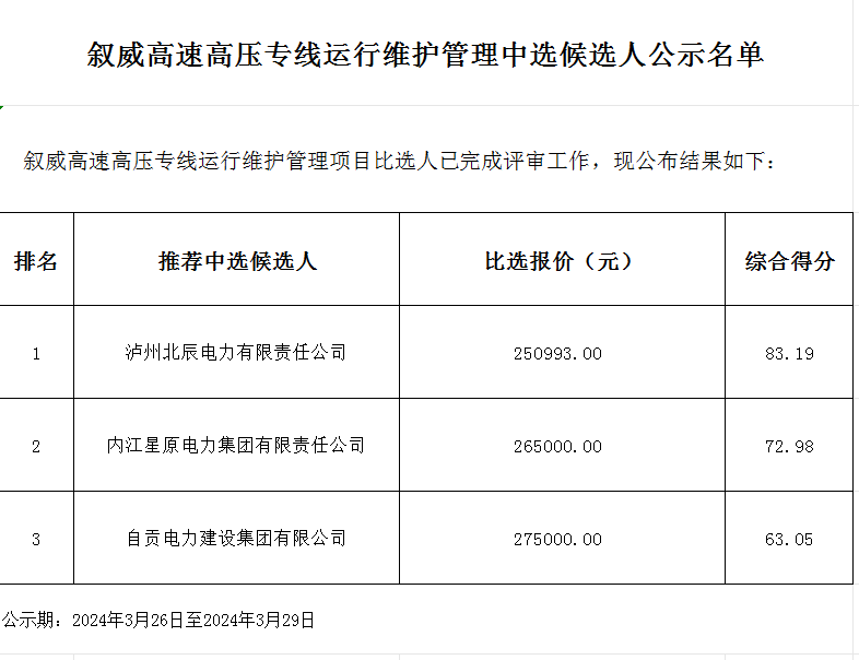 敘威高速高壓專(zhuān)線運(yùn)行維護(hù)管理中選候選人公示名單