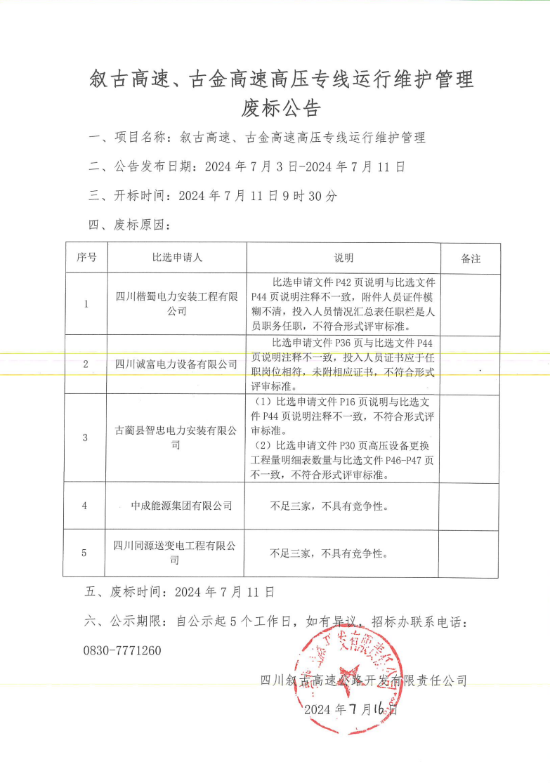 敘古高速、古金高速高壓專(zhuān)線運(yùn)行維護(hù)管理廢標(biāo)公告