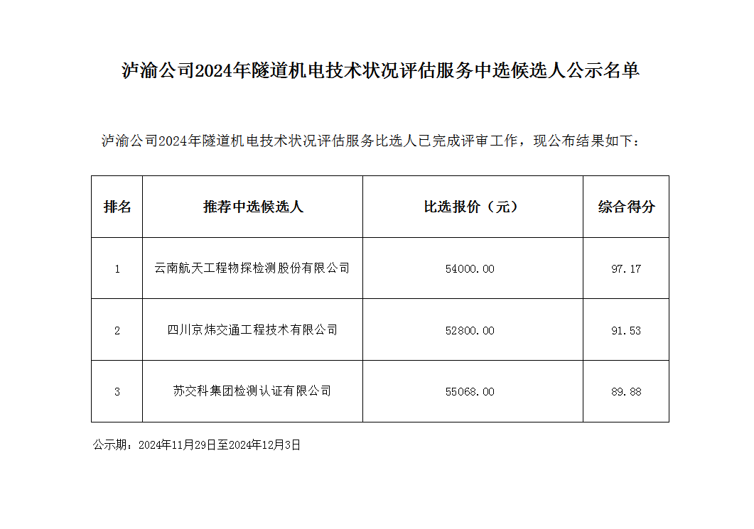 瀘渝公司2024年隧道機(jī)電技術(shù)狀況評(píng)估服務(wù)中選候選人公示名單