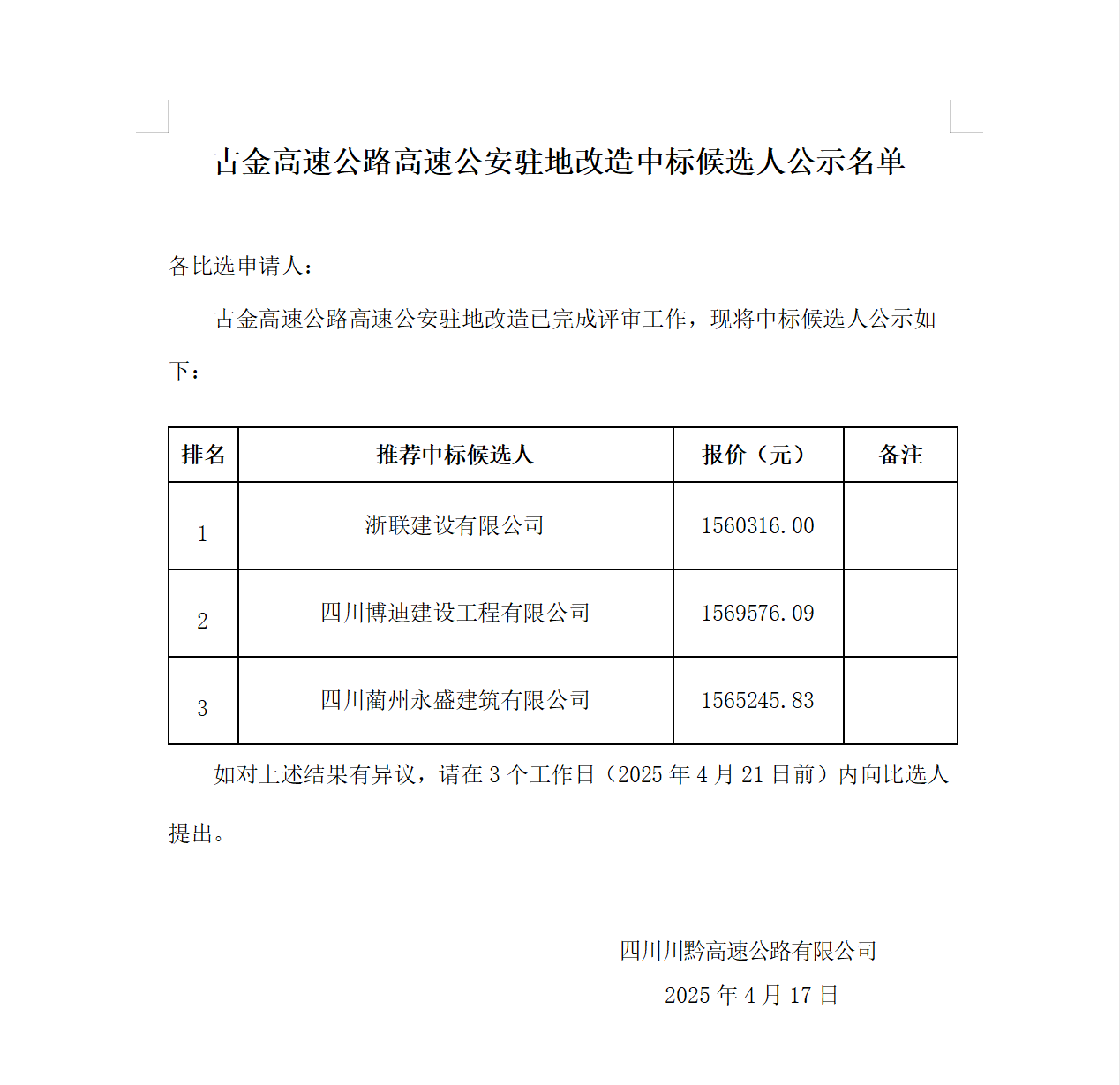 古金高速公路高速公安駐地改造中標候選人公示名單