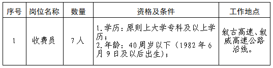 根據敘古敘威公司一線運營管理工作需要,擬面向蜀道集團系統開展收費崗位內部選聘工作。現將相關事宜公告如下: