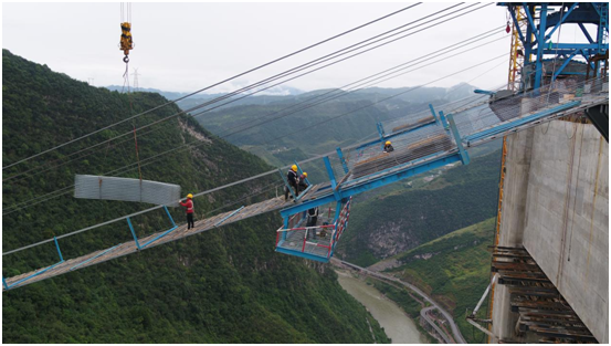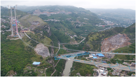 貓道,是懸索橋施工過程中獨有的作業平臺,根據施工設計要求,在四川岸和貴州岸主塔之間分別架設一根主纜,以主纜為中心,向下1.5米的地方各設置一條寬度為4米的貓道。貓道系統由承重、扶手索、門架、橫向通道等十余個部分組成,其主跨長1200米,兩岸邊跨共530米,總長1780米,左右幅貓道間距為27米,每隔一段距離建一條連接道?!柏埖?a>”施工分為單線往復式牽引系統、托架及托架承重繩、貓道承重繩、變位下壓架等關鍵節點。其中,最驚心動魄的當屬“貓道”橫向通道架設和面網鋪裝,在距離谷底四百多米的高空上,峽谷內的高空風力在6級上下,普通人連站在塔頂都會感到手腳發軟頭暈目眩,而經驗豐富的作業工人們身上系著安全帶,腳踩一根根直徑僅54毫米的鋼繩,用扳手鉚緊“貓道”面網的扶手繩、安裝兩跨“貓道”之間的橫梁門架,從兩岸塔頂往中跨小心翼翼地進行面網的鋪裝,大有昔日紅軍四渡赤水、飛奪瀘定橋的英勇豪邁氣概。已經搭建好的“貓道”面層由粗細鋼絲網、防滑木條、門架橫梁及鐵絲防護網等組成,橫向通道及“貓道”面層是在橋塔兩側的工作平臺組拼,“貓道”面采用預制成拼裝網片單元分段鋪設。作為主纜架設和鋼桁吊裝施工的重要施工便道,建設者們將借助它來進一步完成主纜索股牽引、吊索安裝、鋼桁梁吊裝、主纜纏絲防護等施工步驟。