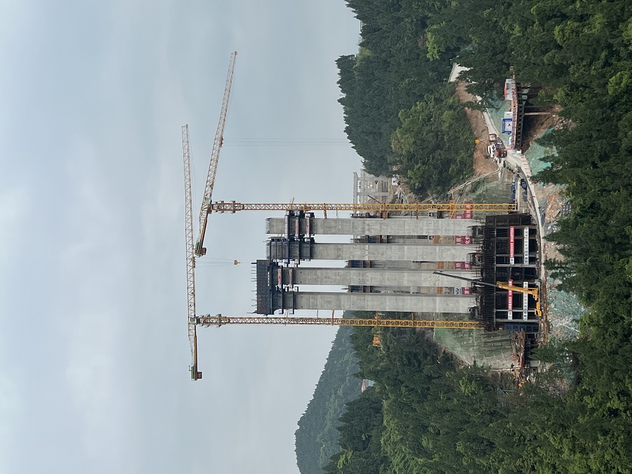 水落河特大橋起點岸(古藺岸)接龍山服務(wù)區(qū),終點岸(金沙岸)接路基段,主橋采用計算跨徑335m上承式鋼筋混凝土懸臂澆筑拱橋,主橋橋面采用跨徑11×31.75m的預(yù)應(yīng)力混凝土簡支Ⅰ梁+組合橋面板,左幅全長1721.25米,右幅全長1676.20米,道路設(shè)計為雙向6車道,時速100公里/小時。該橋區(qū)山勢陡峭,兩岸堤壩近乎直立,橋面至谷底高差250.104米,其施工難度巨大。該橋首次采用高流態(tài)C80低收縮高韌性纖維混凝土,并創(chuàng)新使用掛籃內(nèi)外模液壓智能同步爬升技術(shù)。建成后將是目前世界上最大跨徑懸澆拱橋,在橋梁發(fā)展史上具有里程碑意義。