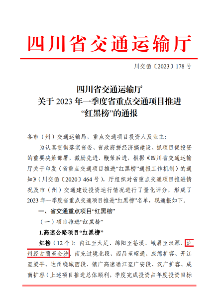 4月19日,四川省交通運(yùn)輸廳發(fā)布《關(guān)于2023年一季度省重點(diǎn)交通項(xiàng)目推進(jìn)“紅黑榜”的通報(bào)》(川交函〔2023〕178號(hào)),川黔公司投建的古金高速榮獲2023年第一季度省交通重點(diǎn)項(xiàng)目中高速公路項(xiàng)目推進(jìn)“紅榜”表彰。